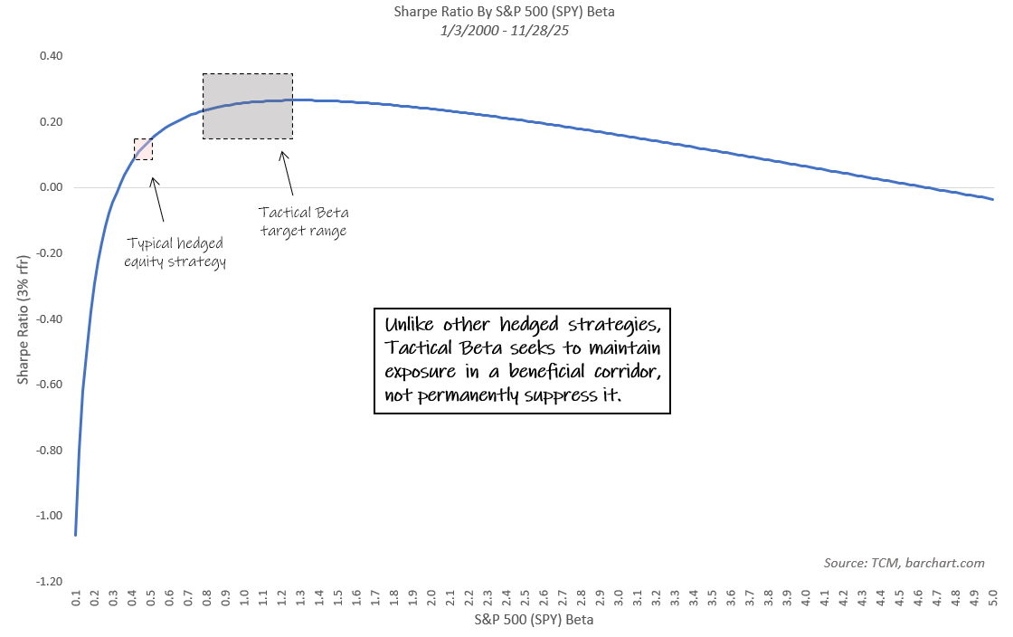 Sharpe Ratio by S&P 500 Beta, 1/3/00 - 11/28/25. Source: TCM, barchart.com. Click for larger image