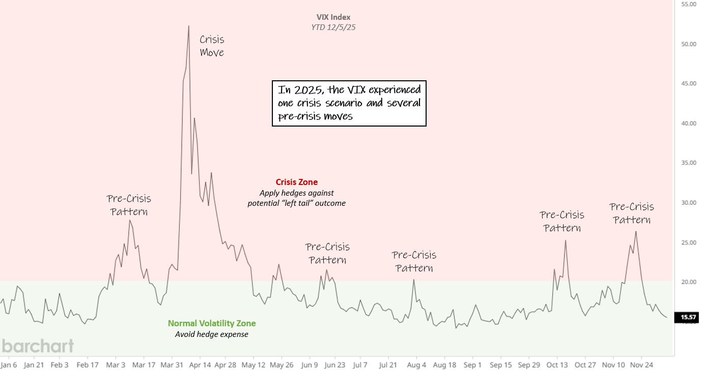VIX Index YTD 12/5/25. Source: barchart.com. Volatility zones are approximate; actual determination is based on signals from the Volatility Dashboard. Click for larger image