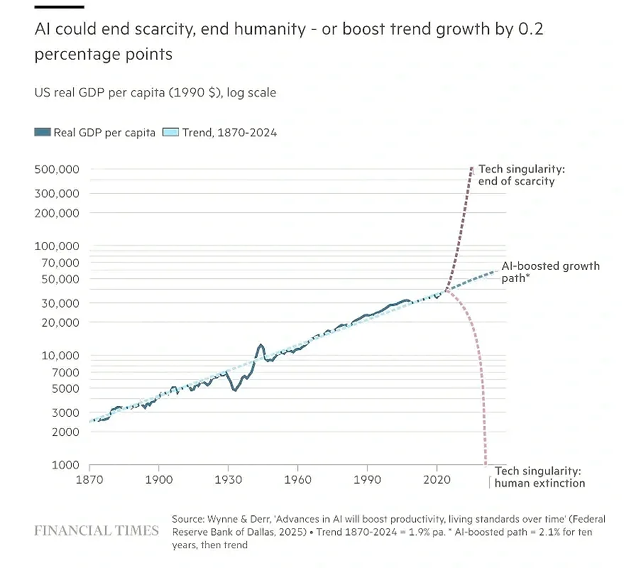 As “AI replacement” fears jump from software to logistics to brokerages, the market seems to be convinced of the massive productivity gains of AI on the one hand, while simultaneously fearing losses on the investments into the same technology- a paradox that reflects the massive uncertainty around AI which could either be the end of scarcity, the end of humanity, or somewhere in between (chart).