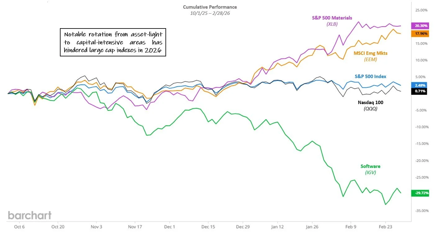 Cumulative Performance 10/1/25 - 2/28/26. Source: barchart.com. Click for larger image
