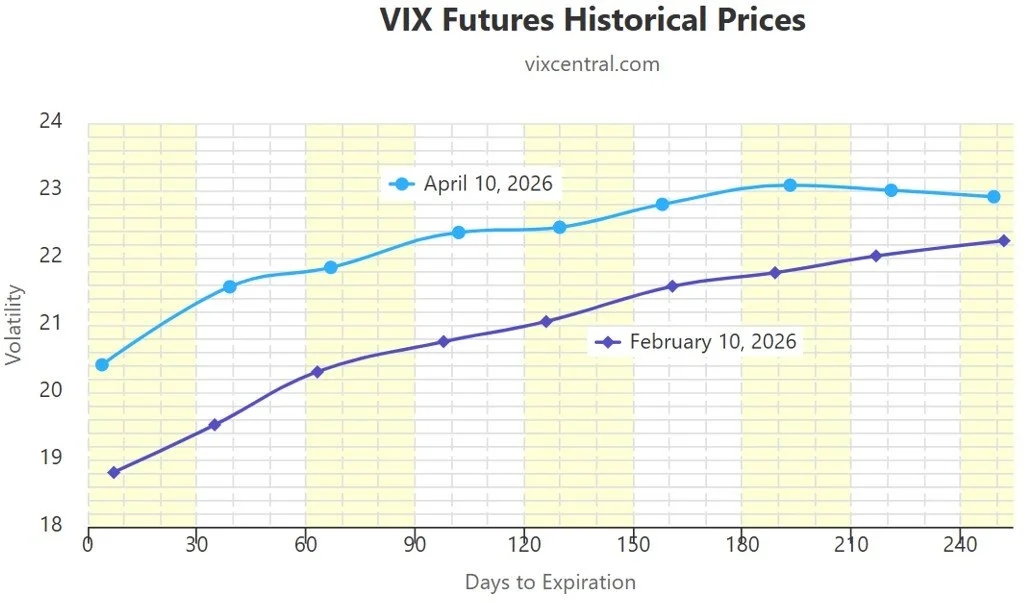 VIX futures curve, 2/10/26 vs 4/10/26. Source: vixcentral.com. Click for larger image